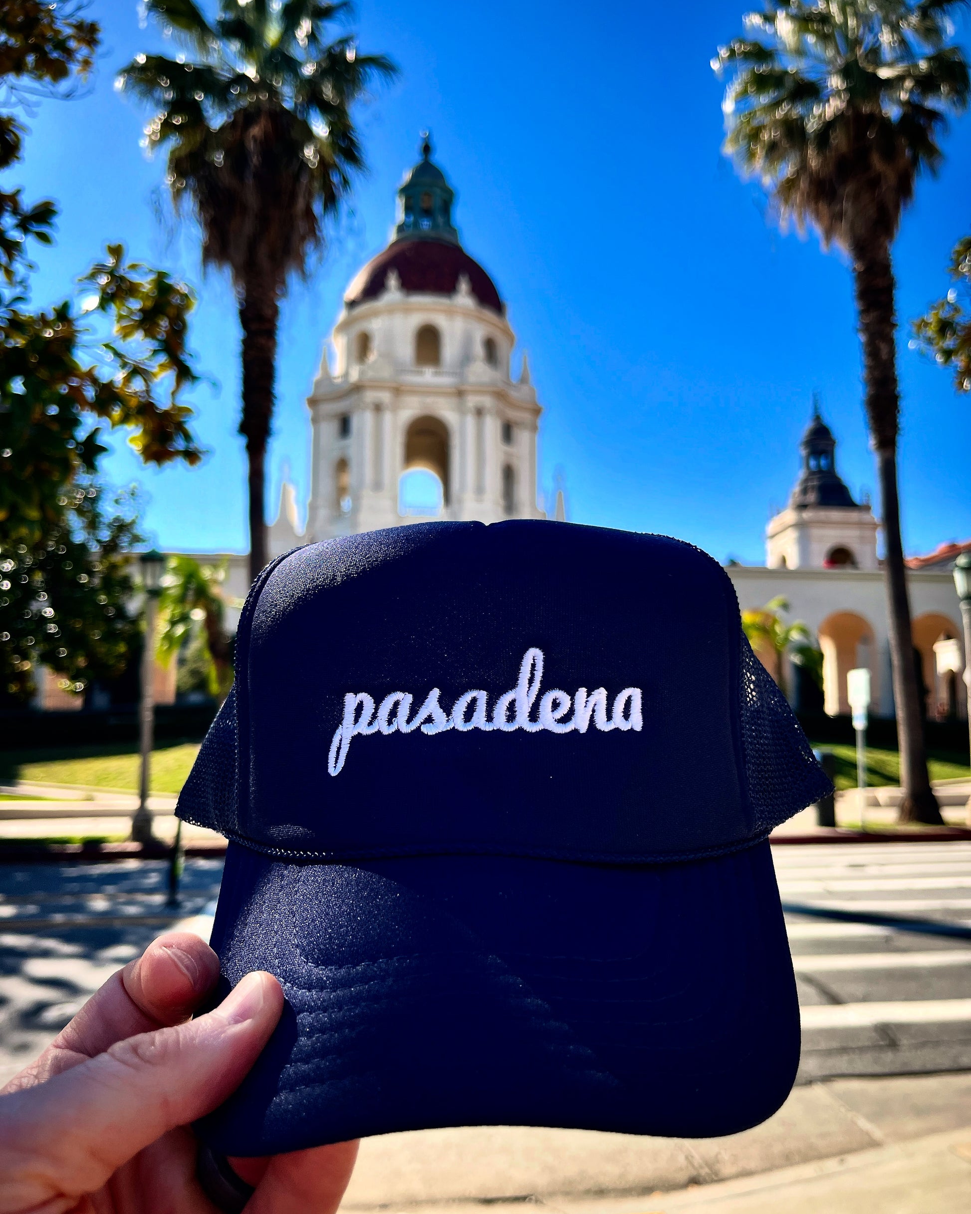 We're obsessed with this design - Pasadena embroidered in a sleek cursive, on a dark navy blue hat that just happens to be our favorite color.